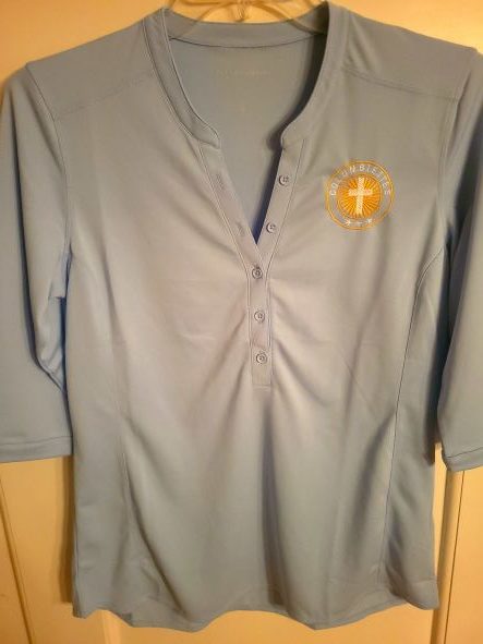 Sizes 3XL and 4 XL Shirt with Columbiette Logo ONLY In GOLD. No additional lettering. 3/4 sleeve, three button, no collar, stretch soft material Color shown: Cloud Blue Sizes S to 2XL.