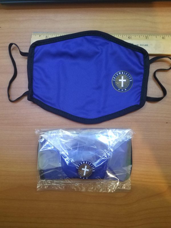 Blue cloth face mask with Columbiette emblem on left side.
