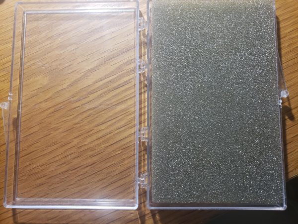 A plastic case with foam to store your jewel. Case is 5 1/4″ x 3 1/4″.